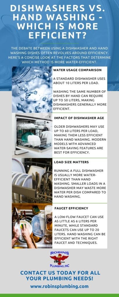 Another factor that can affect the water efficiency of dishwashing is the number of dishes being washed. Running a dishwasher with a small number of dishes may use more water per dish than hand washing. But running a dishwasher with a full load can be more water-efficient than hand washing.