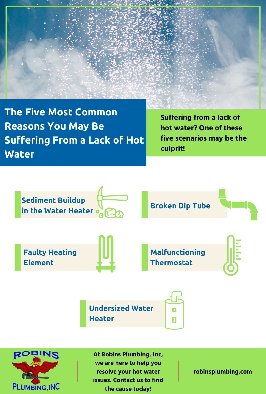 When you’ve found yourself in need of plumbing services in the Phoenix, Glendale, Scottsdale, or Chandler area, you can trust Robins Plumbing. We will provide you with prompt and expert care. Contact our team today! Along with our water heater services, we also offer a variety of residential and commercial plumbing services. Our services include: drain cleaning, water heater repair and replacement, sewer camera inspection and locating, backflow prevention, commercial and residential jetting, water treatments, and more. Visit our reviews online to see what others have to say about our local plumbing company!