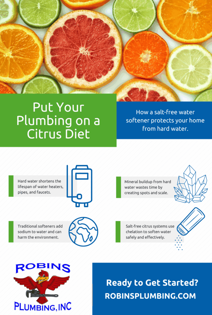 Photo of citrus on a table with Robins Plumbing logo for blog "Put Your Plumbing on a Citrus Diet"