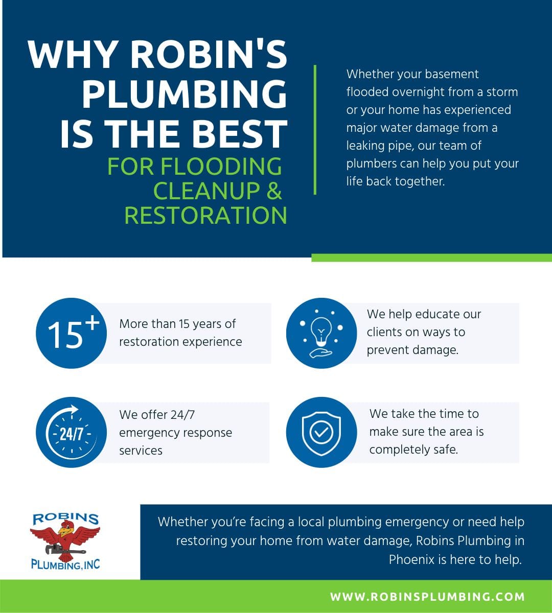 If your home or business has recently experienced water damage from a flood or natural disaster, local plumbing companies like Robins Plumbing are here to help you with your restoration and cleanup services. It can be hard to know where to start when it comes to flooding or water damage in your home or business. Let Robins Plumbing in Phoenix be there for you from the most disaster strikes!