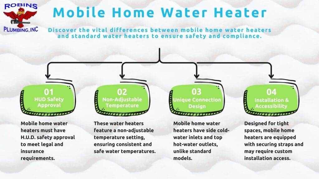 Mobile home water heaters will have a H.U.D. safety approval. Anything else used for a mobile home is against the law. It will also void the manufacturer’s warranty, and will nullify your insurance coverage. Look for a replacement water heater that is made specifically for mobile homes.