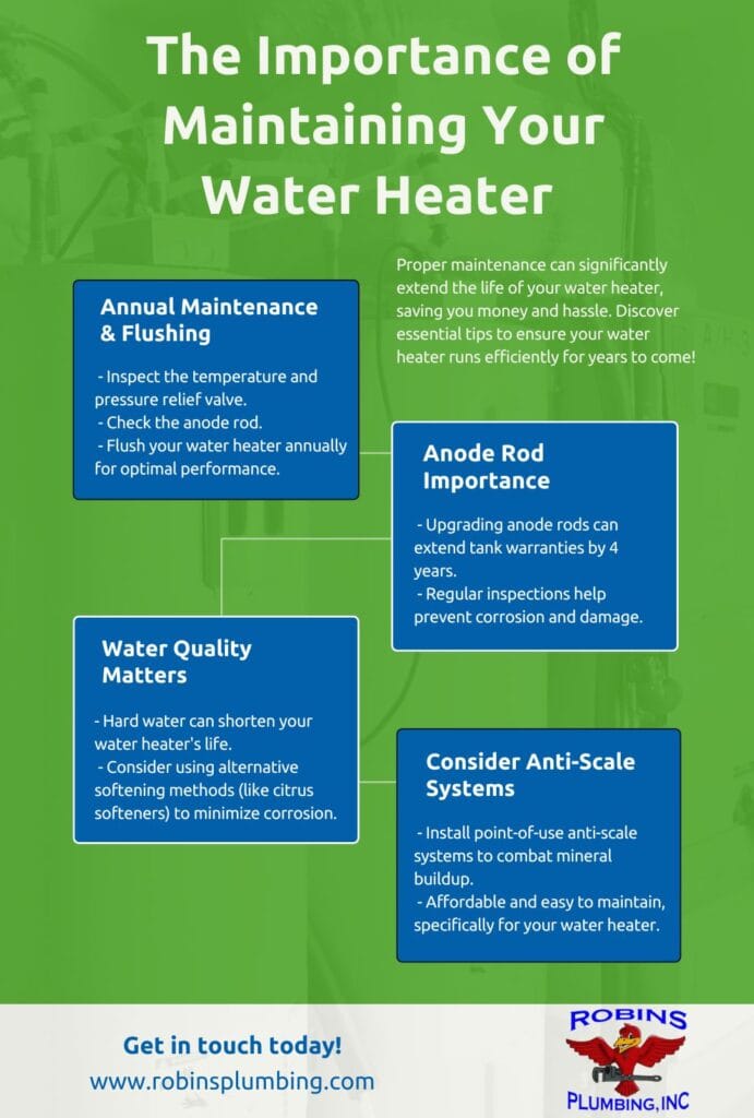 Now that you understand what an anode rod is and how it impacts the lifespan of your water heater, consider getting it inspected during your annual maintenance and flushing. If your water heater has gotten up there in years, then the anode rod may no longer be accessible. It could be seized to the tank and can’t be inspected or replaced. This is why starting with proper annual maintenance on your newly installed water heater is very important! It can quite literally double the lifespan of your tank!